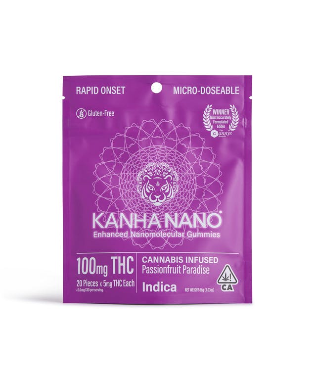 More info 20 pieces x 5mg/gummy = 100mg/bag Kanha Nano utilizes nanomolecular technology to create the first fast-acting gummies in the industry. We take our award-winning, great-tasting gummies and infuse them with cannabinoid particles smaller than a wavelength of light, which increases the speed and amount that enters into your bloodstream. Our Passionfruit Paradise gummies are divinely sweet and made with indica terpenes, which induce a calm and relaxed state of mind. And with only 5mg of THC per gummy and an average of 10-20 minutes for onset, these are the perfect gummy for micro-dosing.