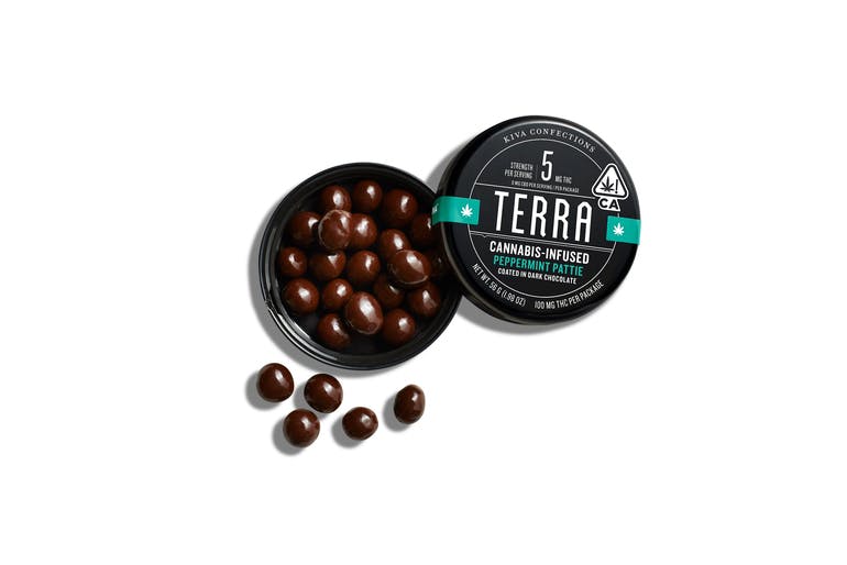 More info Terra Peppermint Pattie has a cool, soft, peppermint fondant center covered in premium dark chocolate.Each 5MG bite takes 10+ hours to create and is handmade using cold water cannabis extract infused into sustainably sourced premium cacao. Since 2010, Kiva’s goal has been to create an edible that redefines what a cannabis confection can be. From our artisanal approach to making chocolates to our inventive take on gummies, we’ve dedicated ourselves to crafting delicious, trustworthy, and premium edibles you can feel good about eating. 20 servings per package. Each serving contains 5mg THC, for a relaxing, balanced experience. Ingredients: Semisweet Chocolate (Sugar, Unsweetened Chocolate, Cocoa Butter, Butter oil, Potassium Carbonate, Sunflower Lecithin, Vanilla), Sugar, Tapioca syrup, Invertase, Gum Arabic, Cannabis Extract, Confectioner's Glaze, Natural Flavors, Sucrose, Glucose Syrup. Dietary Information: Made in a facility that processes milk, nuts, soy and gluten. (License No. CDPH-10002402)