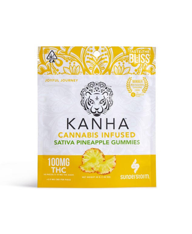 More info 10 pieces x 10mg/gummy = 100mg/bag Kanha gummies are made with all-natural ingredients, coloring, and flavoring. Each gummy is infused with the highest quality cannabis oils to provide the most consistent, safe experience on the market. Our Pineapple gummies are satisfyingly sweet and made with sativa terpenes, which induce a stimulating and uplifting state of mind.