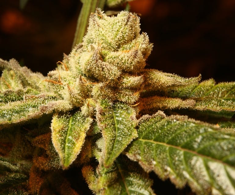 GG#4 (fka Gorilla Glue #4) created by GG strains is a Sativa-dominant hybrid, a multiple award-winning strain, famous for its high THC content. Its THC production ranges from 18% to 27.5%, but you may find it as high as 32 percent at some dispensaries. The CBD is very low, ranging between 0.05 and 0.1 percent. This strain gets its name because of the resin that collects on the scissors when trimming. Gorilla Glue #4 has several parents due to extensive backcrossing – Sour Diesel, Sour Dubb, Chem’s Sister, and Chocolate Diesel. The hybrid strain has won awards at the 2014 Cannabis Cup in both Los Angeles and Michigan. It has been described as a bunch of trichromes with a few buds, leaves, and stalks sticking out. The aroma is very strong and is mostly diesel with notes of chocolate and coffee, although sweet and earthy is also used to describe it. You’ll be going back for seconds due to the full-bodied and flavorful smoke. The buds are green with orange hairs. It is very dense, spongy, resinous, and covered in trichromes.