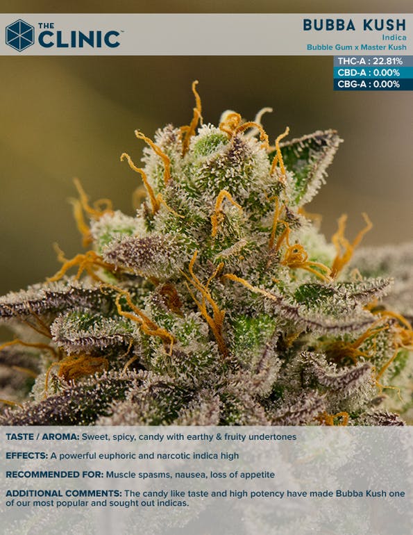 The Clinic WholeSale Flower Bubba Kush offers a cerebral body high with euphoric effects that give a strong case of the munchies. These bud’s aroma is pungent, with a coffee, herbal and sweet flavor.