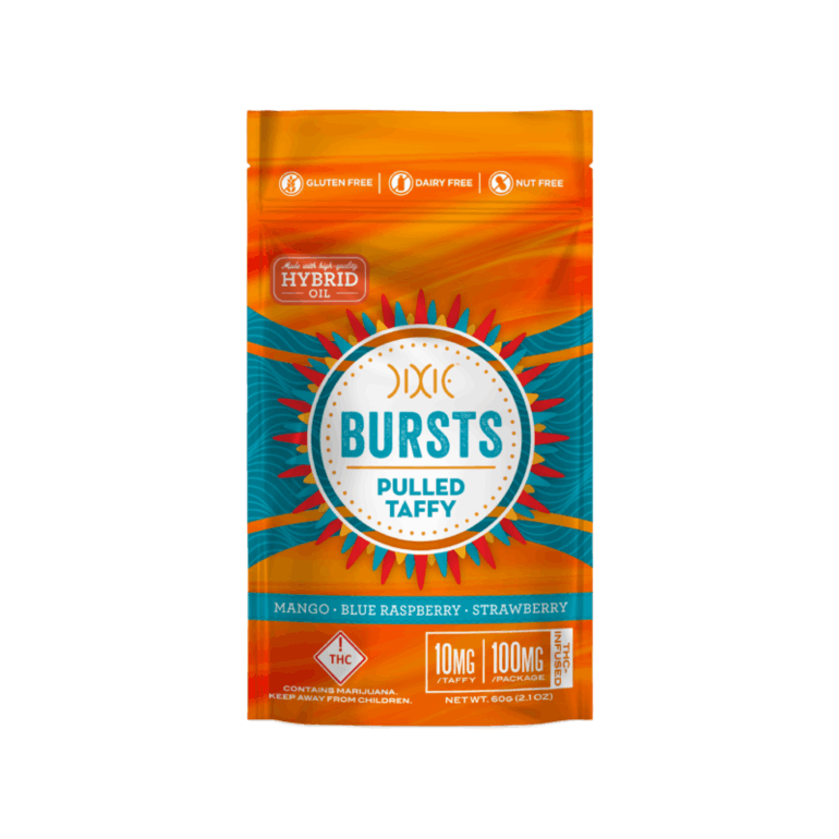Dixie Bursts are an assorted pack or three fruity flavorsthat are sure to make any situation shine a little brighter. The mango, blue raspberry and strawberry taffies are bursting with flavor and are the ultimate discreet dosing edible. Individually wrapped, you can take them anywhere your adventure takes you. 10mg THC per serving, 100mg THC per pack. Great tasting and consistently dosed, individually wrapped to take with you on-the-go or to keep for several days. Dixie Edibles are triple lab tested for consistency and quality. Dosing control – Eat the whole Burst, or bite off a portion for a lower-dose option. Edibles can take longer to take effect than other methods of THC uptake, but the effects often last much longer too. Gluten free, dairy free and nut free. Please call or visit our store for more info.
