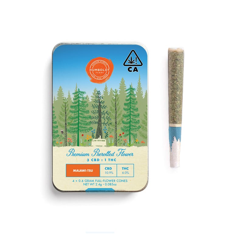 With over a 2:1 CBD to THC ratio, this cross between Malawi and Sour Tsunami brings a wave of relaxation while keeping the mind clear and present. Popular for pain relief and anxiety without psychoactivity. Humboldt Farms use the same sun-ripened, sustainably grown Humboldt County flower found in their jars to make their prerolls. Never shake or trim. Each pack contains 4 prerolls. Each preroll contains 0.6g of flower.