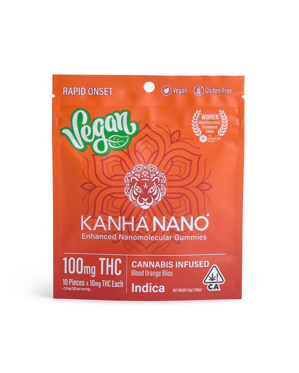Kanha Nano Vegan utilizes nanomolecular technology with a vegan base to create delicious, fast-acting gummies that maintain our signature soft texture. With cannabinoid particles smaller than a wavelength of light, it only takes 10-20 minutes on average to onset. Our Blood Orange Bliss gummies are juicy and sweet, and made with indica terpenes, which induce a calm and relaxed state of mind.