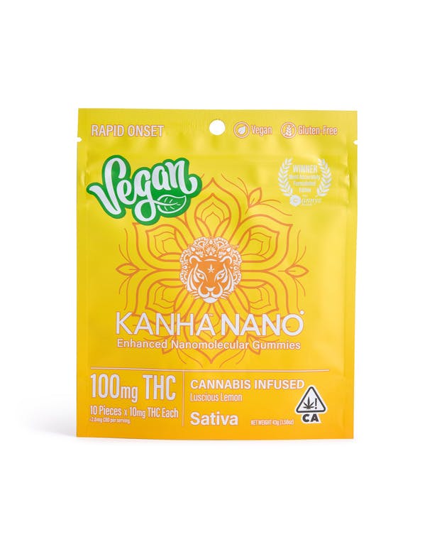 Kanha Nano Vegan utilizes nanomolecular technology with a vegan base to create delicious, fast-acting gummies that maintain our signature soft texture. With cannabinoid particles smaller than a wavelength of light, it only takes 10-20 minutes on average to onset. Our Luscious Lemon gummies are tart yet sweet and made with sativa terpenes, which induce a stimulating and uplifting state of mind.