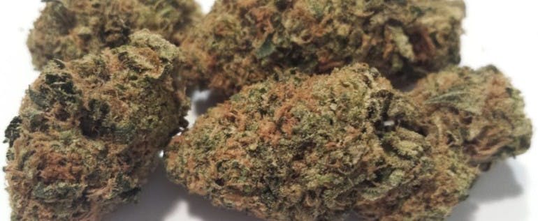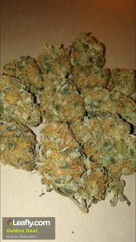 Golden Goat is a cross of Hawaiian-Romulan and Island Sweet Skunk. The strain is often light green and pink in color, which is indicative of its Hawaiian sativa side. The scent is a combination of sweet, sour, and spicy, with a tropical fruit flavor. Effects are strong and felt from head to toe, lasting about 1-2 hours.