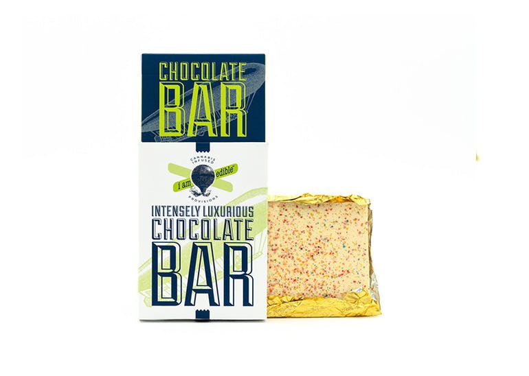 IamEdible THC infused High Dose white chocolate bar sectioned into 20 easy dosing pieces. This infused white chocolate bar is sprinkled with freeze dried strawberries and a graham cracker crust. Ingredients: White Chocolate, Graham Cracker Crust, Freeze Dried Strawberries, Ethanol extracted cannabis oil. Divide total cannabinoids by 20 to get the dosage per piece.
