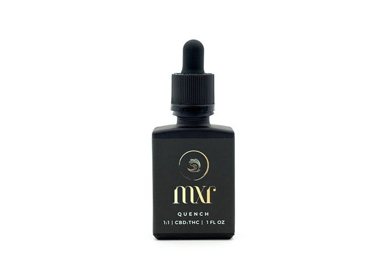 MXR is our new high-end tincture line, exclusive to Rev Clinics! Our 3rd MXR tincture is Quench - formulated as a Cocktail Replacement. This tincture features an equal balance of CBD to THC PLUS Super Sour Diesel Terpenes (essential oils extracted from Cannabis): Pinene (bronchodilator to increase alertness) and Myrcene (acts as muscle relaxer), as well as Limonene (gastroprotective). Quench also features Orange and Spearmint essential oils. 1 fluid ounce bottle. Divide THC and CBD total by 54 to get the dosage per 0.5ml dropper full