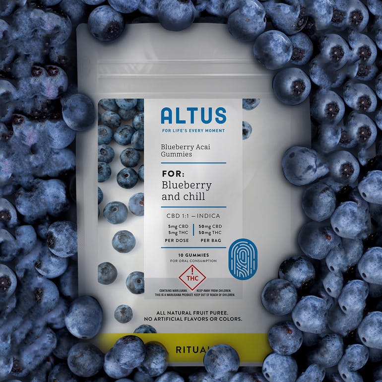Add some delicious Blueberries and Chill to your life with Altus's BLUEBERRY ACAI CBD/INDICA 1:1 Gummies. Featuring 5mg of Indica sourced distillate and 5mg of whole plant CBD isolate and 10 gummies per pack, our "Adult" gummies are made in small batches with all-natural fruit puree, 100% distillate, low sugar and never any artificial flavors or colors.